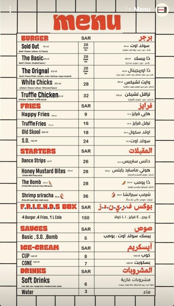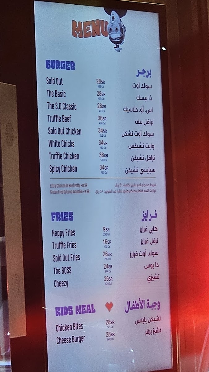 The menu at Soldout Restaurant® مطعم سولد اوت offers a straightforward and comforting selection of casual bites perfect for lunch, quick dinners, or relaxed takeout moments. Featuring classic American-style fast food with a focus on grilled and fried chicken, burgers, and flavorful sides, it fits naturally into a welcoming family-friendly setting or a casual meet-up with friends.